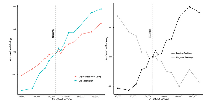 The paper states: “Higher incomes may still have potential to improve people’s day-to-day wellbeing, rather than having already reached a plateau for many people in wealthy countries. […] There is no evidence of an income threshold at which experienced and evaluative wellbeing diverged, suggesting that higher incomes are associated with both feeling better day-to-day and being more satisfied with life overall.”